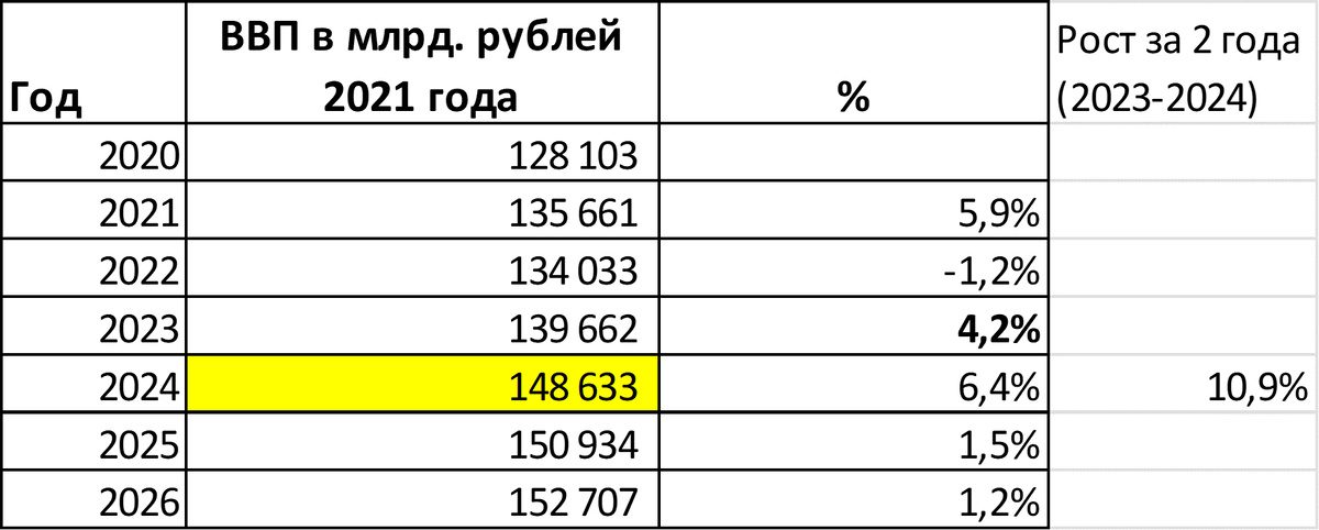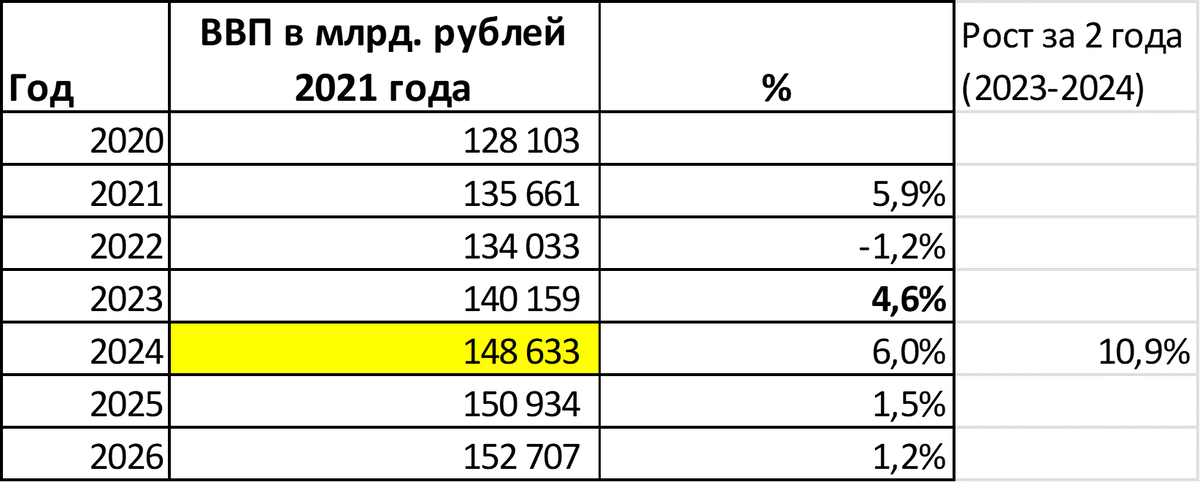 Возможны и другие комбинации роста ВВП за эти два года. Например, если ВВП в 2023 году вырастет на 4,6%, то ВВП в 2024 году -- на 6,0% (см. таблицу ниже).