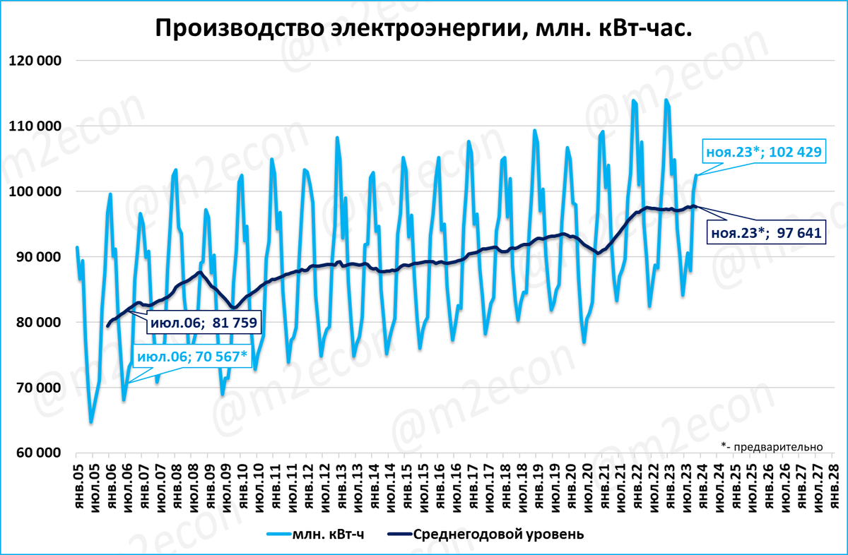 По предварительным данным производство электроэнергии в ноябре составило 102,4 млрд. кВт-час.