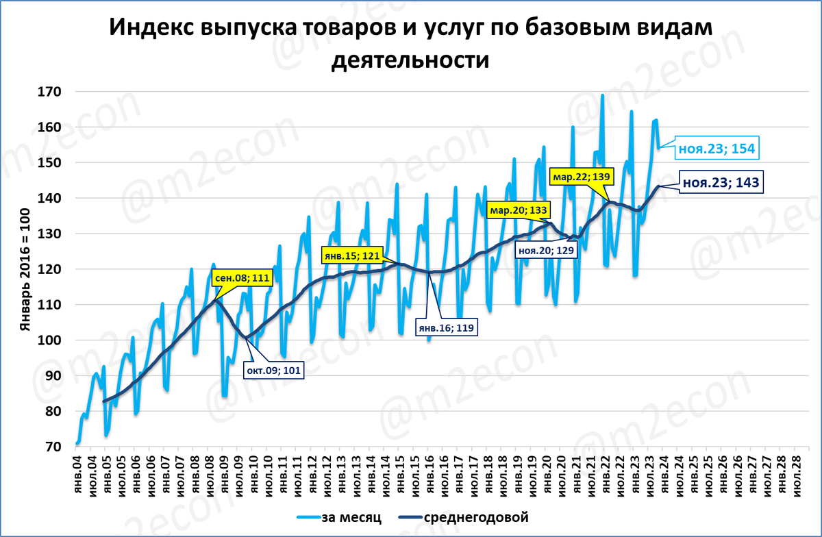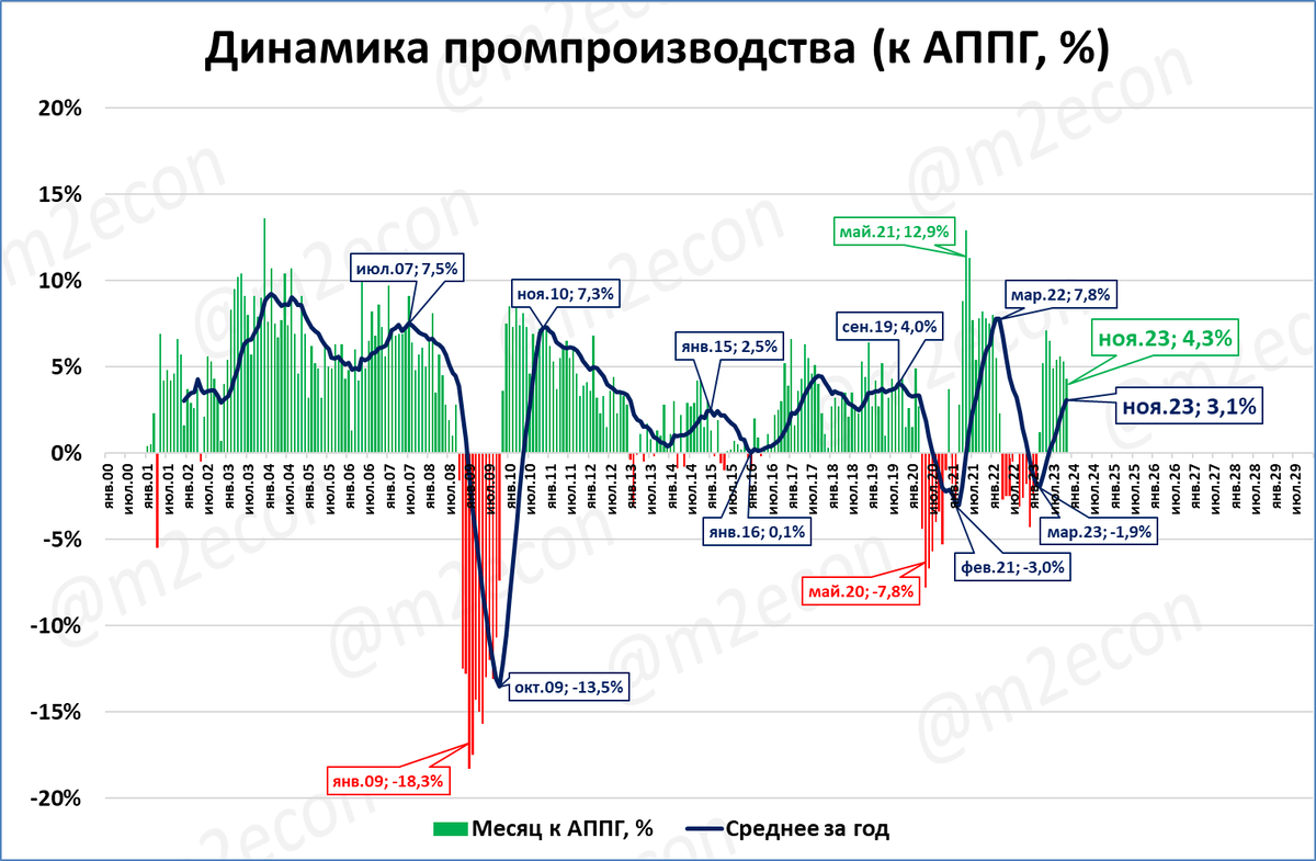 Если рост в декабре будет чем-то средним между октябрём и ноябрём, то рост в 4 квартале составил 4,75%. Рост по итогам 2023 года в этом случае составит +3,5%.