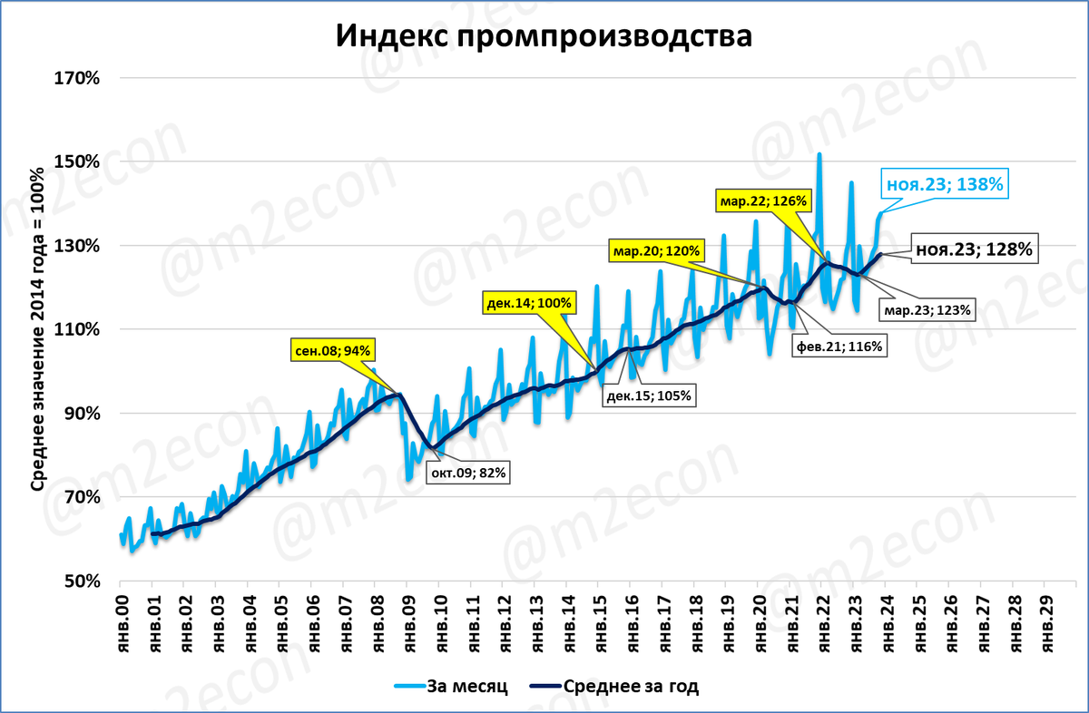 Как и по базовым видам деятельности, прошедший месяц стал лучшим ноябрём за всю историю по объёмам промпроизводства.