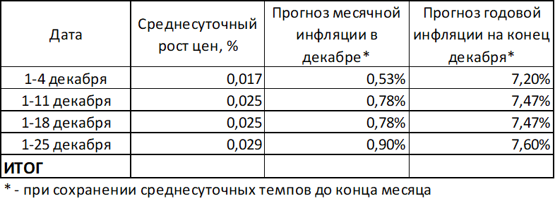 Инфляция по итогам года составит около 7,6%, что близко к октябрьскому прогнозу ЦБ (7-7,5%).