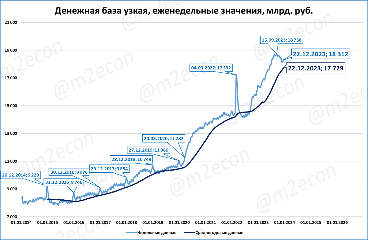 Узкая денежная база (УДБ) ещё немного подросла за неделю и на 22 декабря составила 18,3 трлн. рублей.