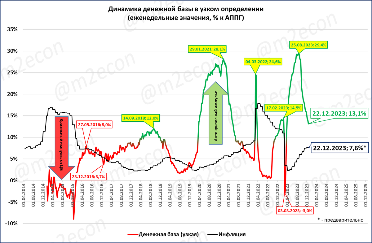 В декабре рост узкой денежной базы быстро замедляется. Это один из признаков того, что замедляется и рост денежной массы.