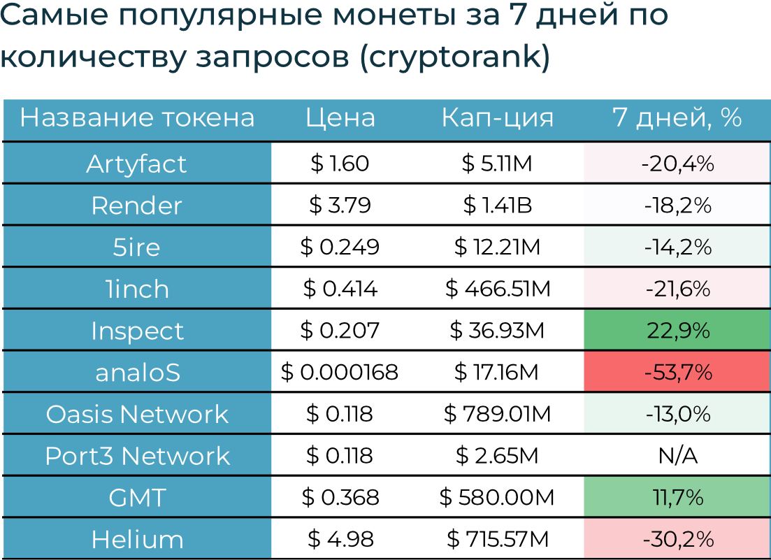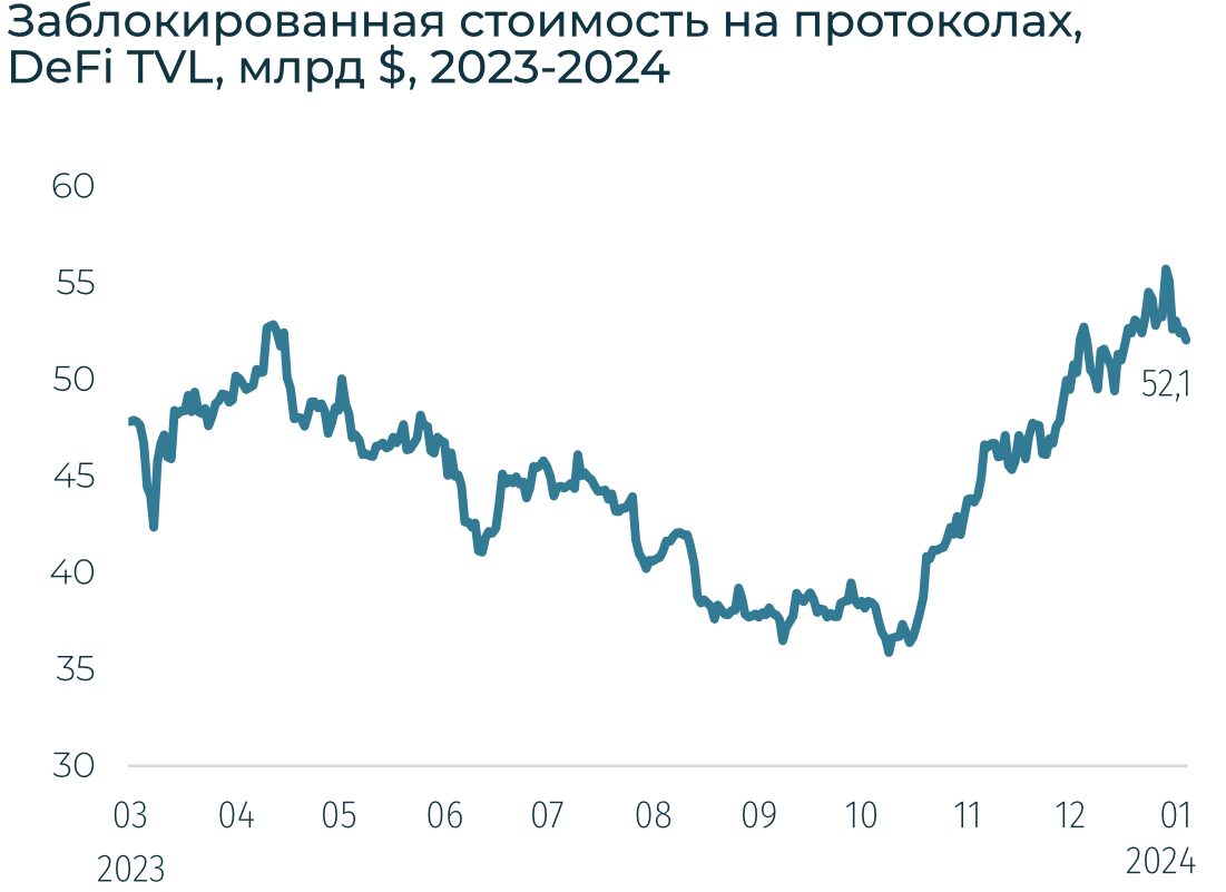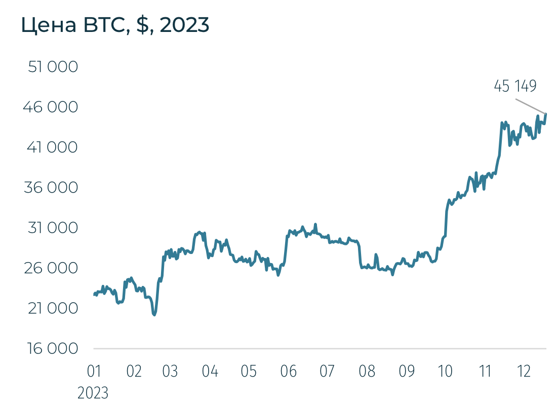 Криптовалютный рынок замер в ожидании действий от SEC. Консенсус экспертов предполагает, что спотовые BTC-ETF будут одобрены в среду 10 января, и торги начнутся 11-го. При этом дедлайн для одобрения от SEC — май 2024-го. Шансы негативного результата на этой неделе рынок оценивает в 5-10%. При этом BTC вырос на 2,2%, при этом активность китов (операции свыше $100 тыс.) дошла до рекордного с июня 2023-го уровня. Однако другие криптовалюты показали негативные результаты: ETH — сократился на 3,3%, SOL — после ралли упала на 13,3%, Cardano и Ripple снизились на 18% и 10% соответственно.