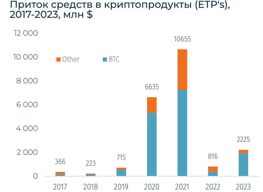 Притоки в криптопродукты за последние две недели — положительные: +$230 и +$151 млн. Всего притоки в крипто ETP в 2023 составили 2,2 млрд, что в 2,8 раз выше, чем в 2022-м. Однако все еще в 5 раз ниже, чем в 2021-м.