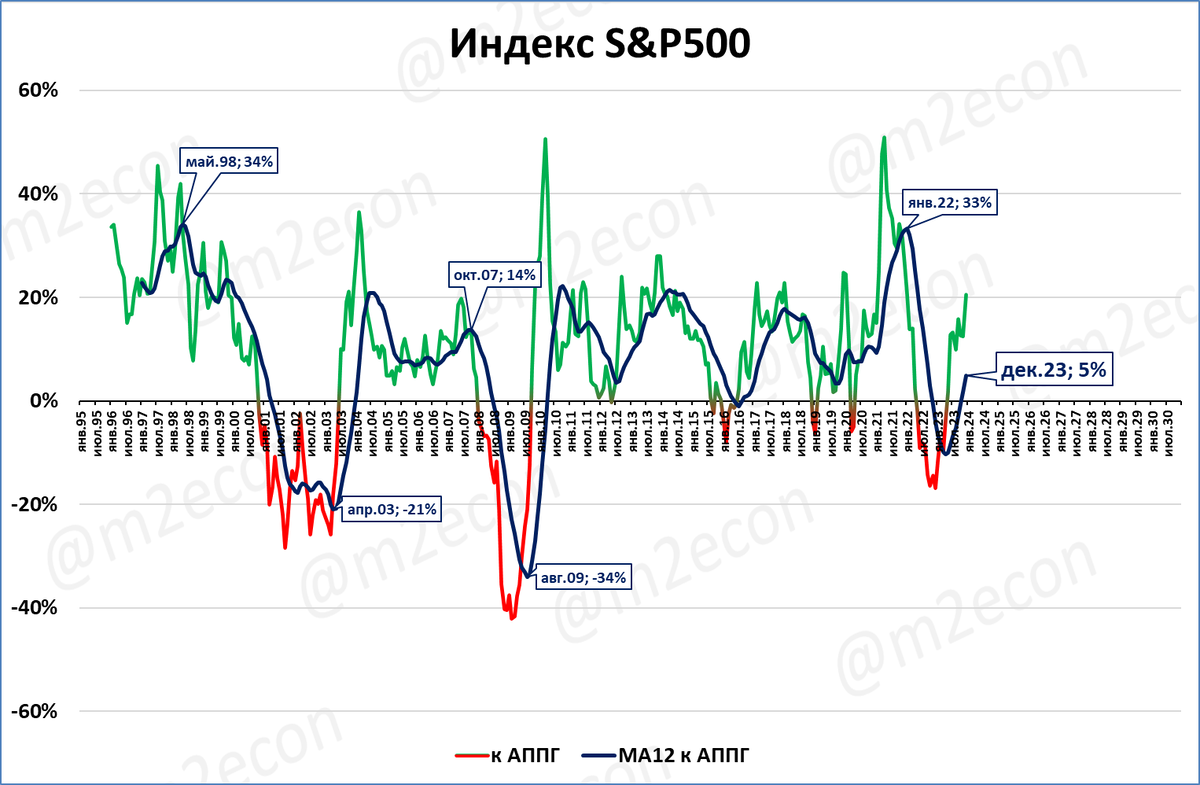 Если текущие темпы роста опустятся ниже среднегодовых темпов (зелёные столбцы на втором графике опустятся ниже синей линии), это будет одним из признаков возможного падения индекса.