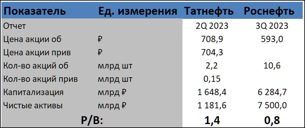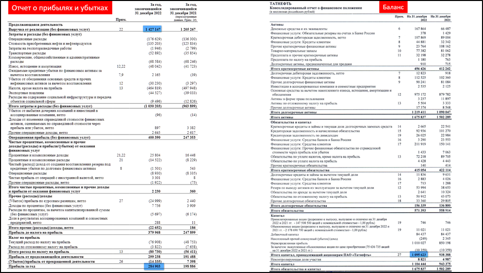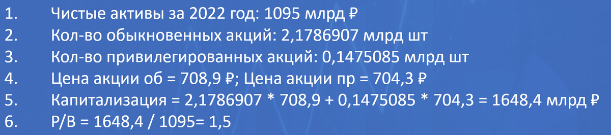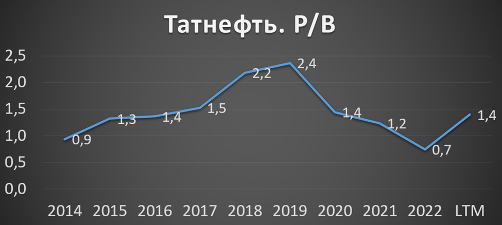 Проведём расчет P/B для компании Татнефть на основе отчета за 2022 год. В балансе указано, что собственный капитал 1095 млрд. Таким образом, P/B = 1,5.