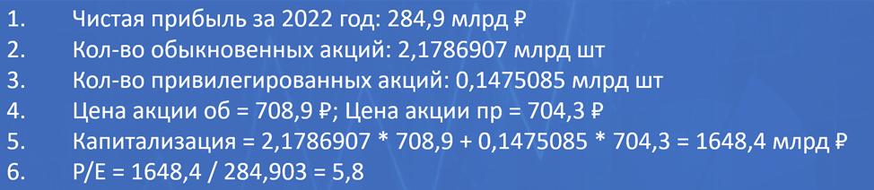 Из любого биржевого терминала узнаем текущую цену акций. И теперь мы можем самостоятельно рассчитать мультипликатор P/E. Подставим все значения в формулу и получим, что P/E = 5,8. Это означает, что если ЧП сильно не изменится, то вложения в компанию окупятся примерно за 6 лет.