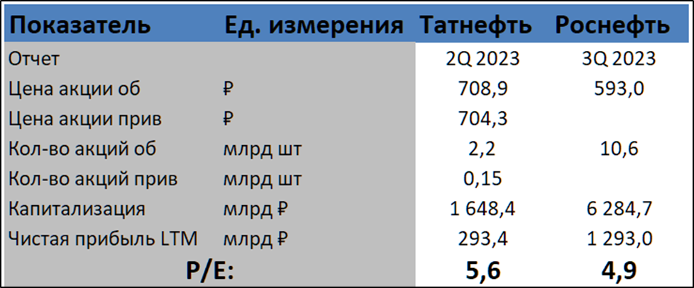 Но обращу внимание, что мы взяли текущие цены акций, а чистую прибыль за 2022 год. А на сайте Татнефти есть более свежий отчет за первое полугодие 2023 года. В нём указано, что за полгода ЧП = 147,6 млрд. Так вот, в данном случае, чтобы делать расчет на самых свежих данных, нужно взять ЧП за 1П 2023 года и ЧП за 2П 2022 года. И если мы просуммируем эти значения, то получим чистую прибыль за последние 12 месяцев. Обычно последние 12 месяцев обозначают как LTM (Last Twelve Months). LTM ЧП = 293,4 млрд.