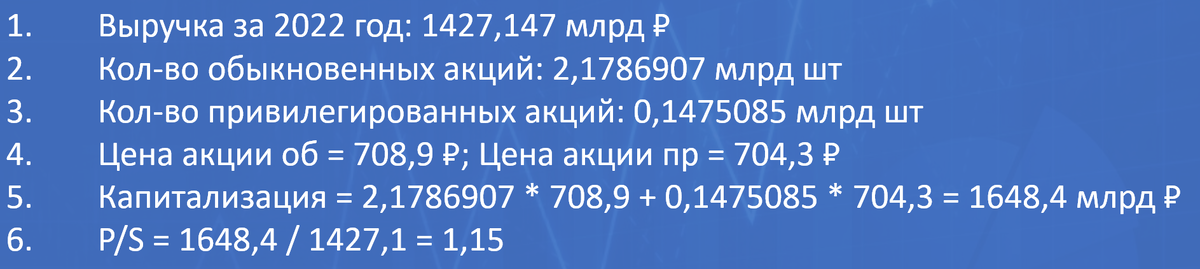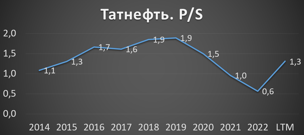 Проведём расчет P/S для компании Татнефть на основе отчета за 2022 год. Из него получим, что выручка 1,427 трлн. Подставим значения в формулу и получим, что P/S = 1,15.