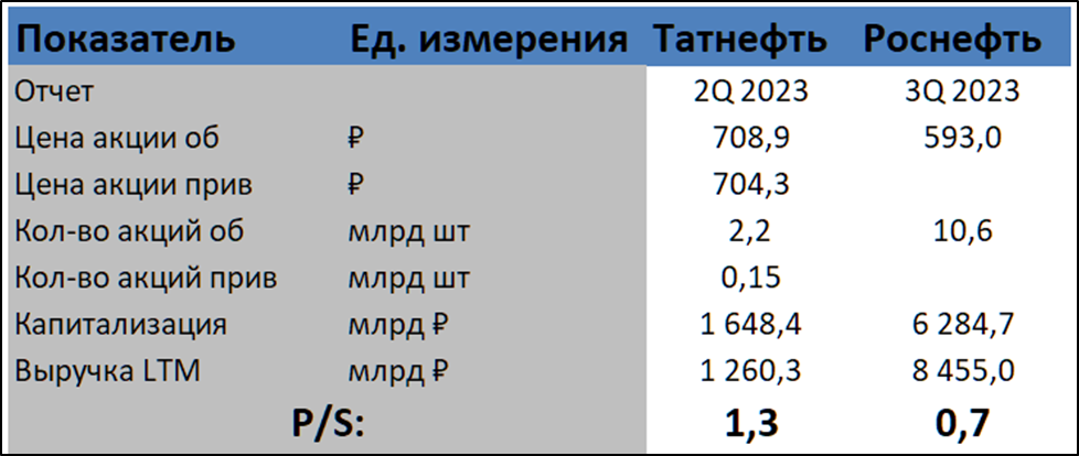 Сравним с Роснефтью. Видим, что на данный момент по мультипликатору P/S Татнефть также стоит дороже Роснефти, у которой P/S = 0,7.