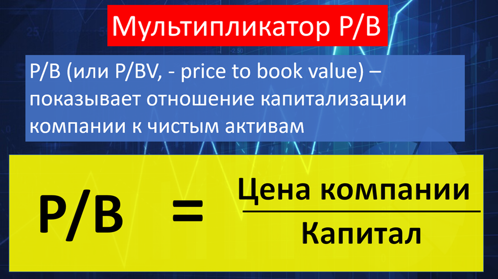 Мультипликатор P/B (или по-другому P/BV, сокращенно от price to book value) — это отношение капитализации к стоимости чистых активов компании. Простыми словами, чистые активы— это деньги, которые останутся у компании после продажи ее активов и погашения всех долгов перед кредиторами. Т.е. активы минус обязательства.