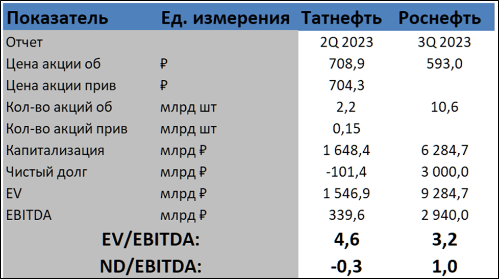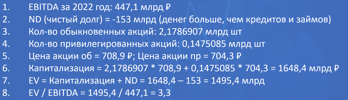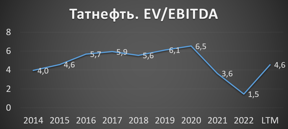 Проведём расчет EV/EBITDA для компании Татнефть на основе отчета за 2022 год. Откуда получим значением EBITDA = 447,1 млрд, которое привела сама компания. Там же указано значение чистого долга: ND = -153 млрд. В итоге, подставив значения в формулу, получим: EV/EBITDA = 3,3.