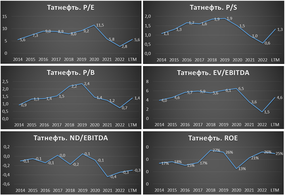 В этом обзоре мы построили диаграммы, отображающие исторические значения мультипликаторов для компании Татнефть. По ним видно, что в целом акции еще немного недооценены относительно средних значений.