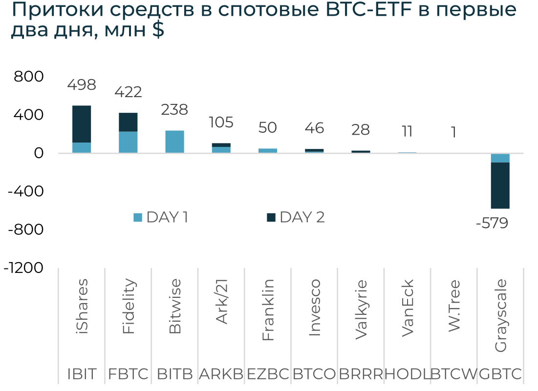 Фокус недели. Объемы торгов спотовыми ETF в первый день (11 января) составили $4,5 млрд, и $3,2 млрд 12-го. 51% и 57% соответственно — торги фонда Grayscale GBTC, который почти перестал быть дисконтным: с начала года дисконт цен акций к цене активов упал с 8% до 1,55%, минимального уровня с февраля 2021-го. Доля крупнейших 4 фондов в первый день: GBTC, IBIT (BlackRock), FBTC (Fidelity), ARKB (Ark 21Shares), — составила 95,4%. За два дня торгов чистый приток в 10 спотовых BTC-ETF составил $0,8 млрд. При этом единственный фонд с минусом — крупнейший GBTC. Без него приток составил $1,4 млрд. Напомним ранее, JP Morgan оценивали, что большая часть из $2,7 млрд притока в GBTC в 2023-м рассчитывает на короткий заработок на снижении дисконта после одобрения спотовых ETF.