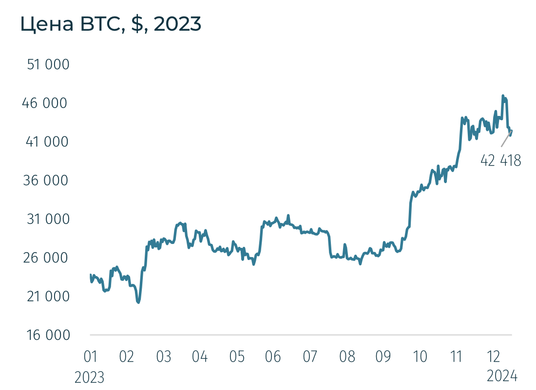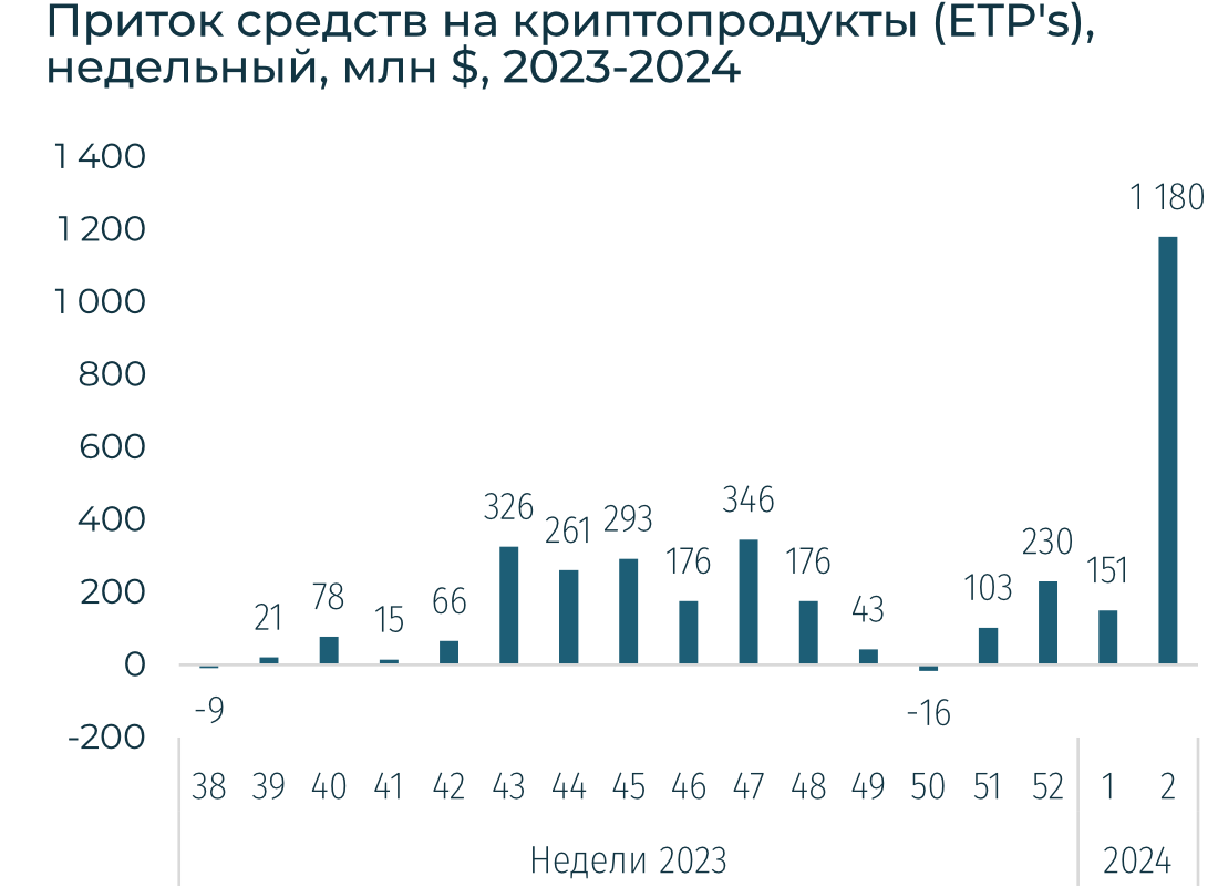 BTC за неделю снизился на 9,7% до 42,4 тыс., ETH — вырос на 8%. Притоки в криптопродукты резко выросли до $1,2 млрд на фоне $0,8 млрд притока в спотовые BTC-ETF. Всего притоки в крипто ETP в 2023 составили $2,2 млрд, что в 2,8 раз выше, чем в 2022-м. Однако все еще в 5 раз ниже, чем в 2021-м.