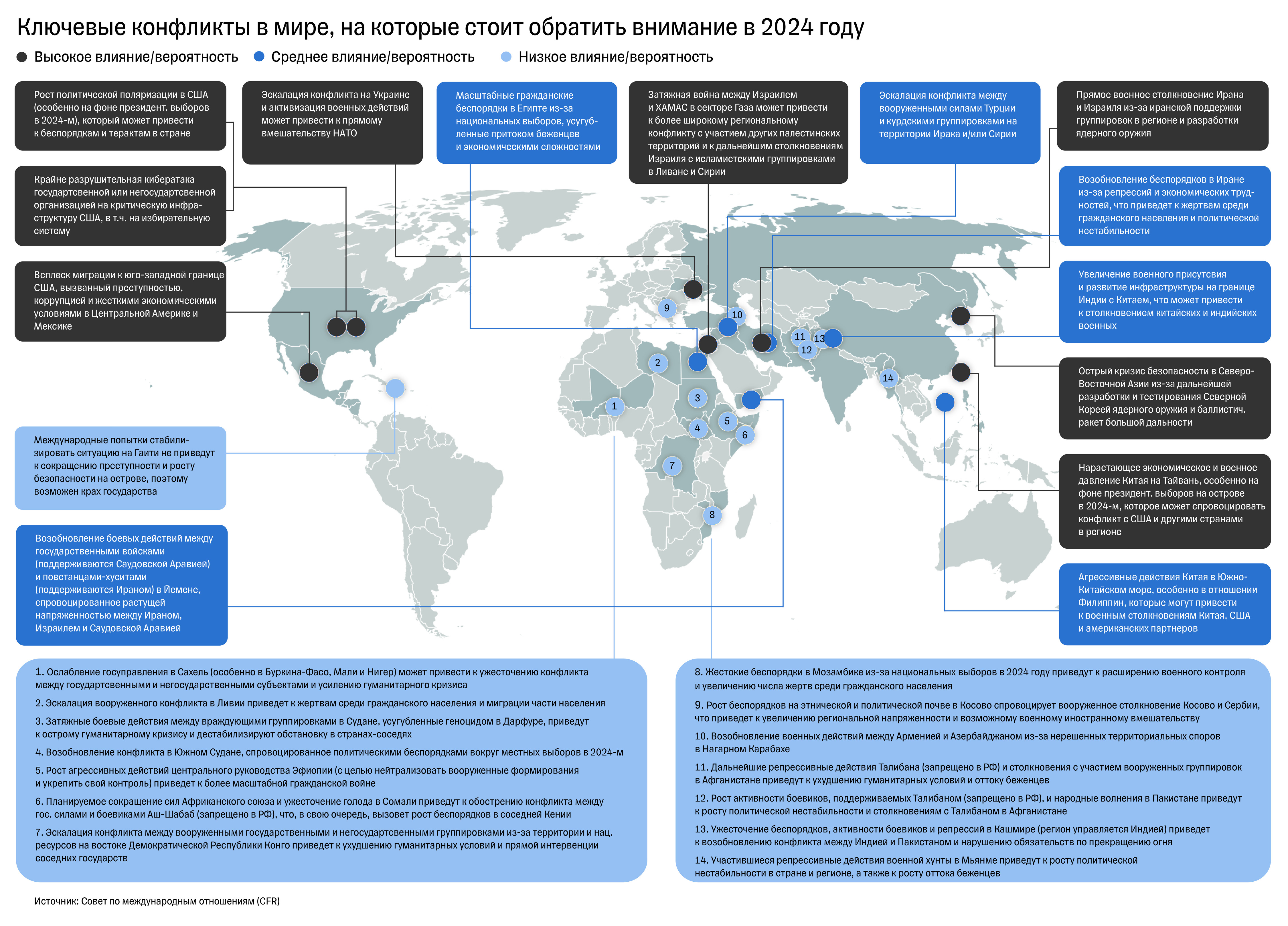 Совет по международным отношениям (CFR, американская организация) провел опрос экспертов по внешней политики, предложив им оценить 30 текущих/потенциальных конфликтов в мире на основе вероятности их возникновения или эскалации в этом году.