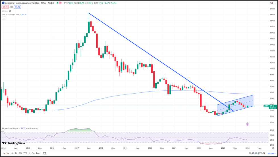 С максимумов 2017 года акции упали уже на 80%. Но на месячном графике пробита линия сопротивления нисходящего тренда. И даже сформировался небольшой тренд вверх. К слову, за 2023 год акции выросли более, чем на 40%, т.е. примерно на уровне индекса Мосбиржи.