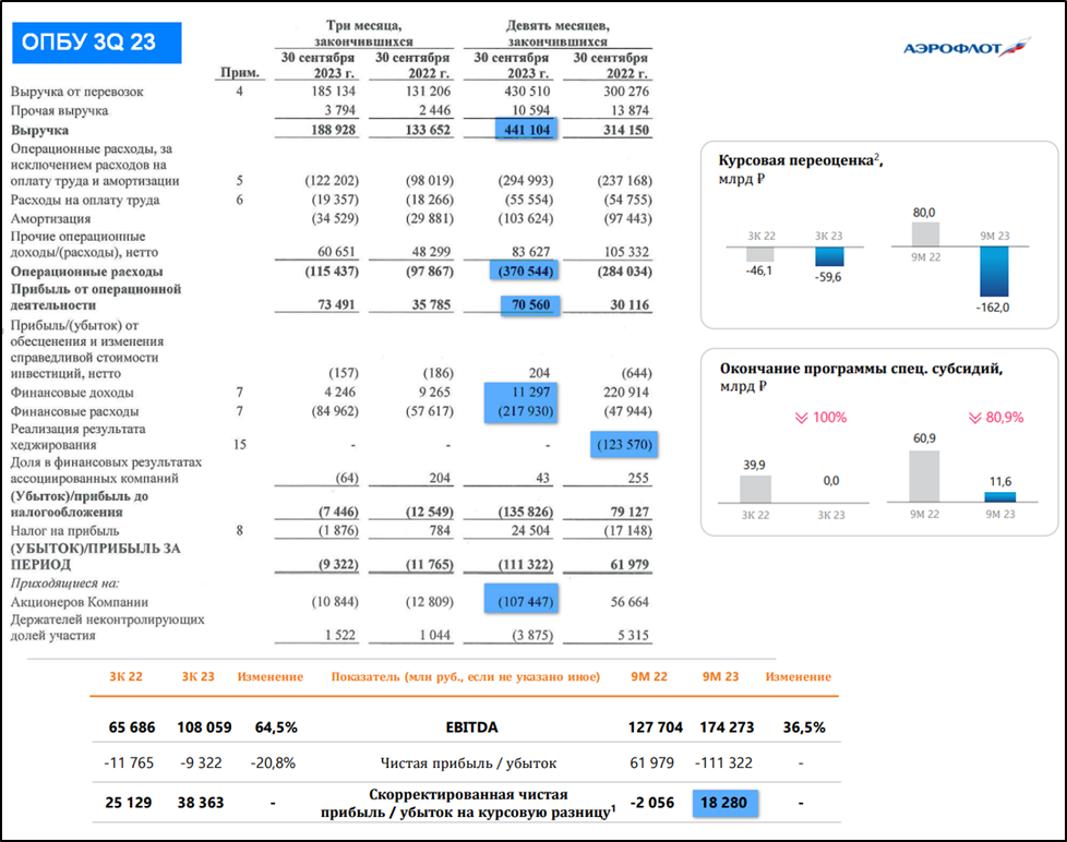 Традиционно, третий квартал самый сильный в году, это связано с сезоном отпусков. Вот и в 2023 году получилось также: 3Q 23 лучше первых двух кварталов, и за исключением EBITDA лучше г/г. А если чистый убыток 11 млрд также скорректировать на бумажные курсовые разницы, то получим, что на самом деле, компания получила ЧП скорр = 38,3 млрд. Но конечно, если вычесть разовые прочие доходы, то всё же будет небольшой убыток.