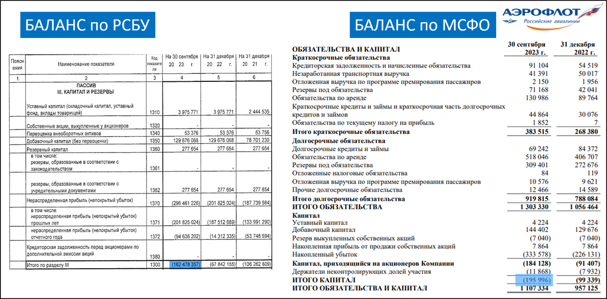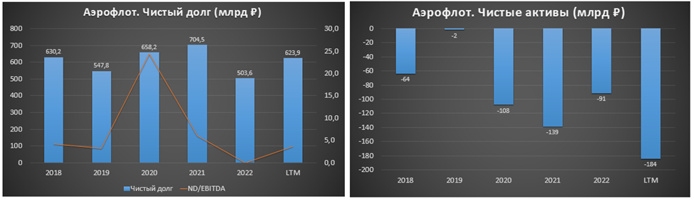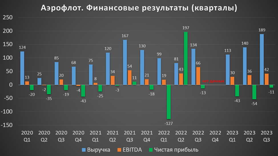 Вообще видно, как трудно компания проходит кризисные времена. Начиная с 2020 года Аэрофлот ежеквартально фиксирует убытки. Правда, было два исключения, в частности, за Q2 22 отражена сверх прибыль 197 млрд, полученная также за счет переоценки лизинговых обязательств из-за резкого укрепления рубля.