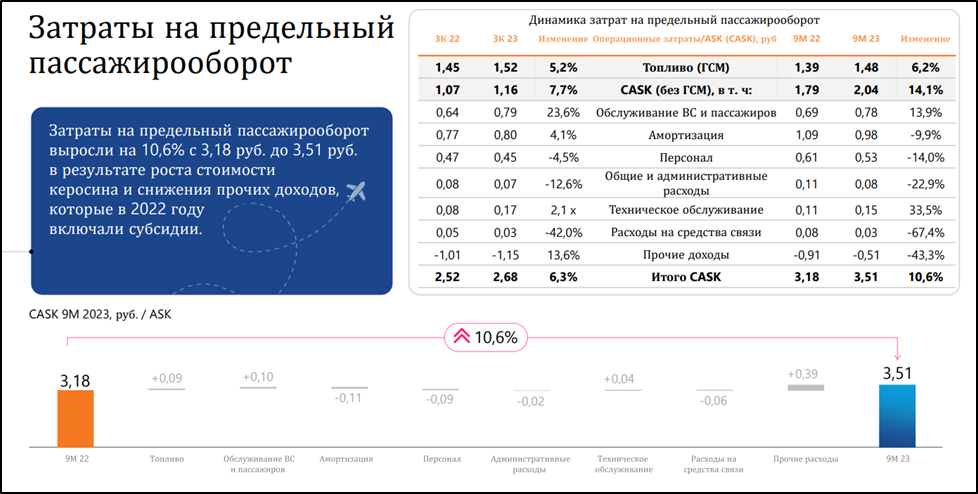 Отдельно рассмотрим показатель CASK (Cost Available Seat Kilometer) - затраты на предельный пассажирооборот, или по-другому, затраты на перевозки в расчете на одно кресло-километр. Они составили 3,51₽ (+10% г/г). Увеличение из-за роста стоимости топлива, инфляции, девальвации и отсутствия субсидий. При этом, как мы видели выше, доход с каждого пассажира в среднем составляет 4,38 рубля. Т.е. компания зарабатывает ориентировочно 87 копеек с каждого пассажира за перевезенный километр.