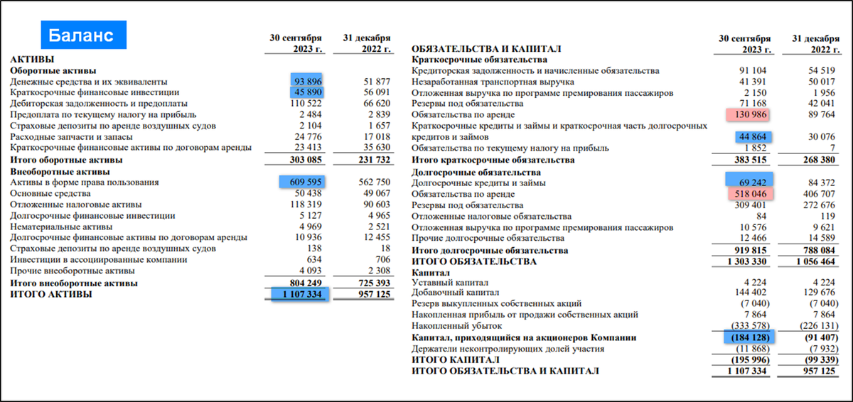 Основная причина огромного убытка – это большие отрицательные курсовые разницы на 162 млрд (бумажная переоценка лизинговых обязательств). Если произвести корректировку на эти «бумажные» курсовые расходы, то получим, что ЧП скорр = 18 млрд. Т.е. в действительности, компания отработала 9М 23 с прибылью. Правда, не будем забывать про разовые прочие доходы 40,8 млрд, без них всё равно был бы убыток.