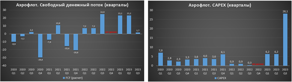 В итоге, свободный денежный поток (FCF = ОДП – CAPEX – проценты по договорам аренды) последние кварталы положительный. В 3Q 23 FCF меньше, чем в 1Q и 2Q, из-за резкого роста капекса.