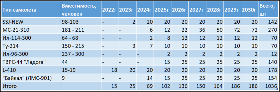 Согласно государственной программе развития авиаотрасли, к 2030 году российский авиапром должен нарастить долю отечественных лайнеров с нынешних 33% до 81%. Всего до 2030 г. запланированы поставки 1036 самолетов. Из них 494 с вместимостью более ста человек. При этом 339 ВС должен получить "Аэрофлот", который подписал соответствующее соглашение с ОАК в ходе ВЭФ-2022.