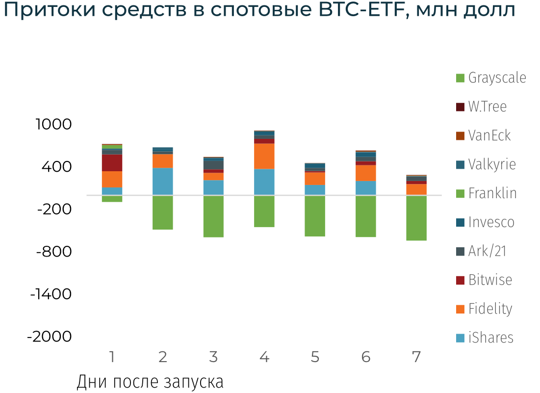 Спотовые BTC-ETF. Притоки средств за первые 7 дней составили $0,8 млрд. Если исключить крупнейший фонд GBTC — приток составил $4,2 млрд. При этом напомним, что JP Morgan писали про $2,7 млрд притока в GBTC в 2023-м, под сокращение дисконта. Уже с фонда вышло $3,5 млрд. Также добавим, что комиссии GBTC — самые высокие из фондов, инвесторы могут перекладывать средства в его конкурентов. Объем торгов за 5 дней составил $14,1 млрд. При этом объемы торгов фондами ex-GBTC в 5 день выросли на 34%. Средства из европейских криптопродуктов «перетекают» в США. С 11 по 19 января отток с топ-6 BTC-ETP в Европе составил $134 млн. Отметим, что американские ETF недоступны для европейцев с 2018-го.