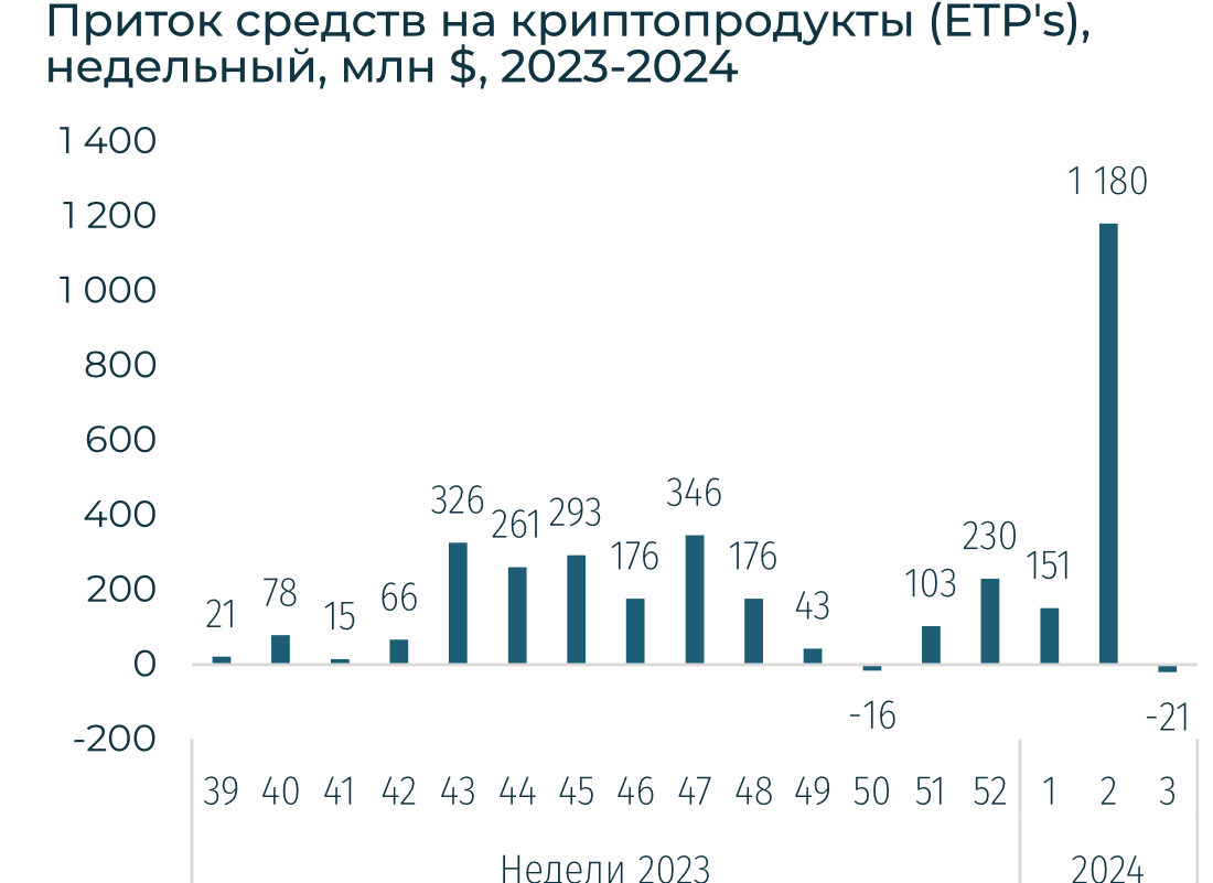 BTC за неделю снизился на 7,2% до $40,1 тыс., ETH — также сократился на 9,5%. Вместо рекордных притоков в $1,2 млрд на позапрошлой неделе, был зафиксирон отток в $21 млн. За первые 7 дней притоки в спотовые BTC-ETF составили $788 млн, в т.ч. отток в $3,5 млрд из крупнейшего фонда GBTC. Всего притоки в крипто ETP в 2023 составили $2,2 млрд, что в 2,8 раз выше, чем в 2022-м. Однако все еще в 5 раз ниже, чем в 2021-м.