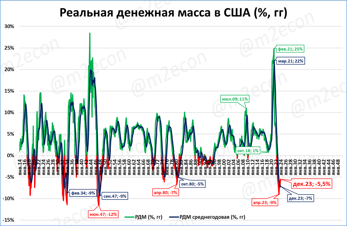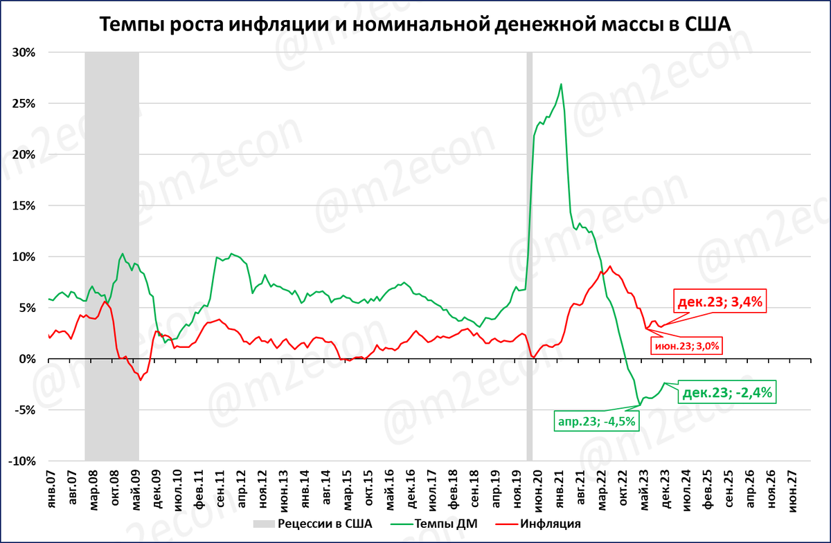 В США денежная масса сжалась в 2023 году на 2,4%. Несмотря на сжатие денежной массы (в номинальном виде падение наблюдается впервые с 1930-х годов, времён Великой депрессии) ВВП продолжает расти. На наш взгляд, это объясняется беспрецедентным денежным смягчением 2020-2021 годов, на которое ВВП в эти годы не мог реагировать из-за ковидных ограничений.