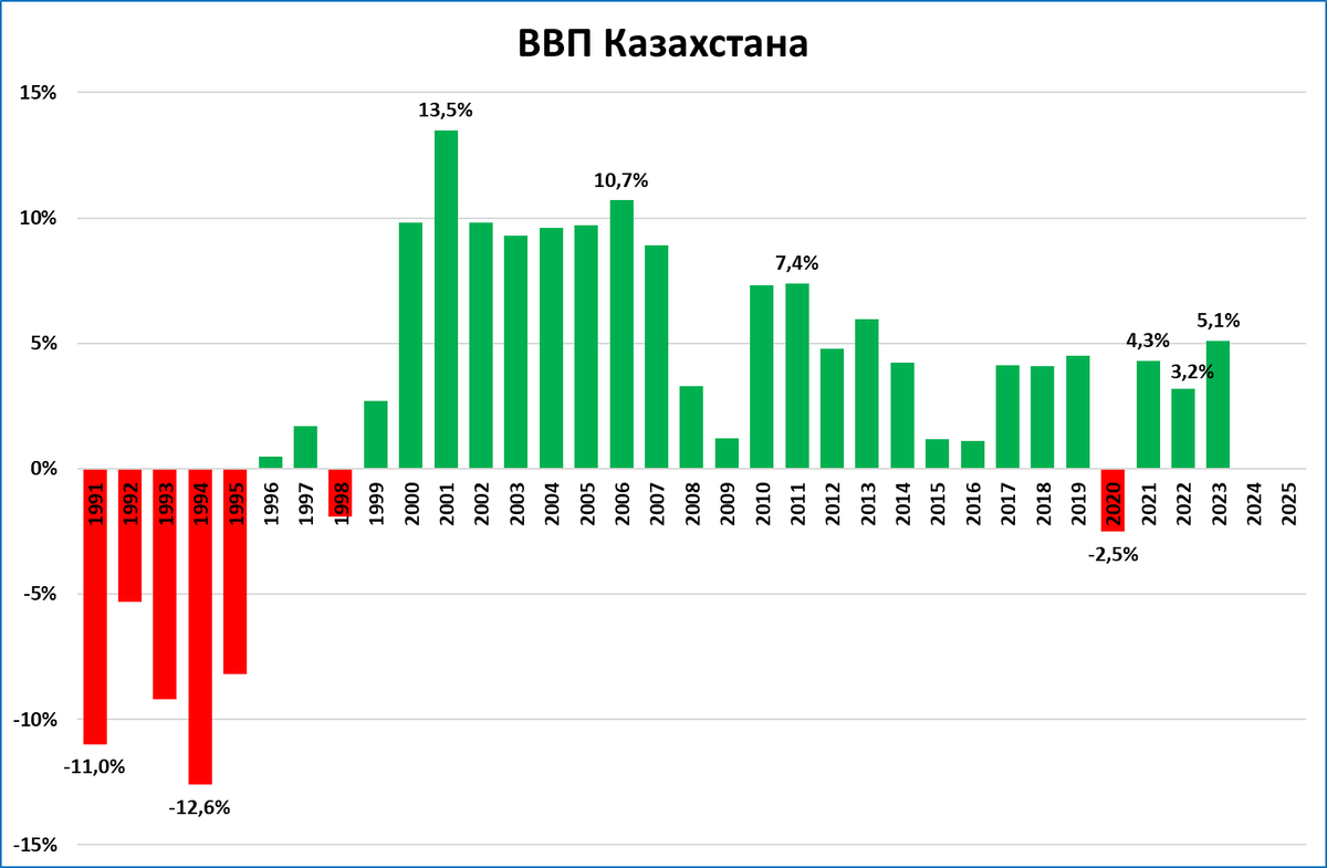 В Казахстане ВВП в 2023 году вырос на 5,1%. Рост выше 5% наблюдается там впервые за последние 10 лет (с 2013 года).