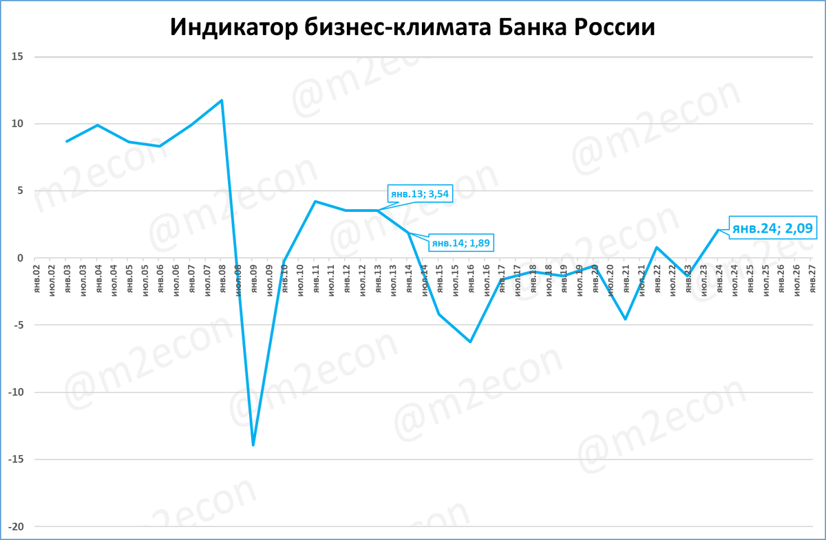 ЦБ опубликовал свой индикатор бизнес-климата за январь. Мы используем исходные (не сезонно-сглаженные) данные этого индикатора: 2,09 пункта в январе.