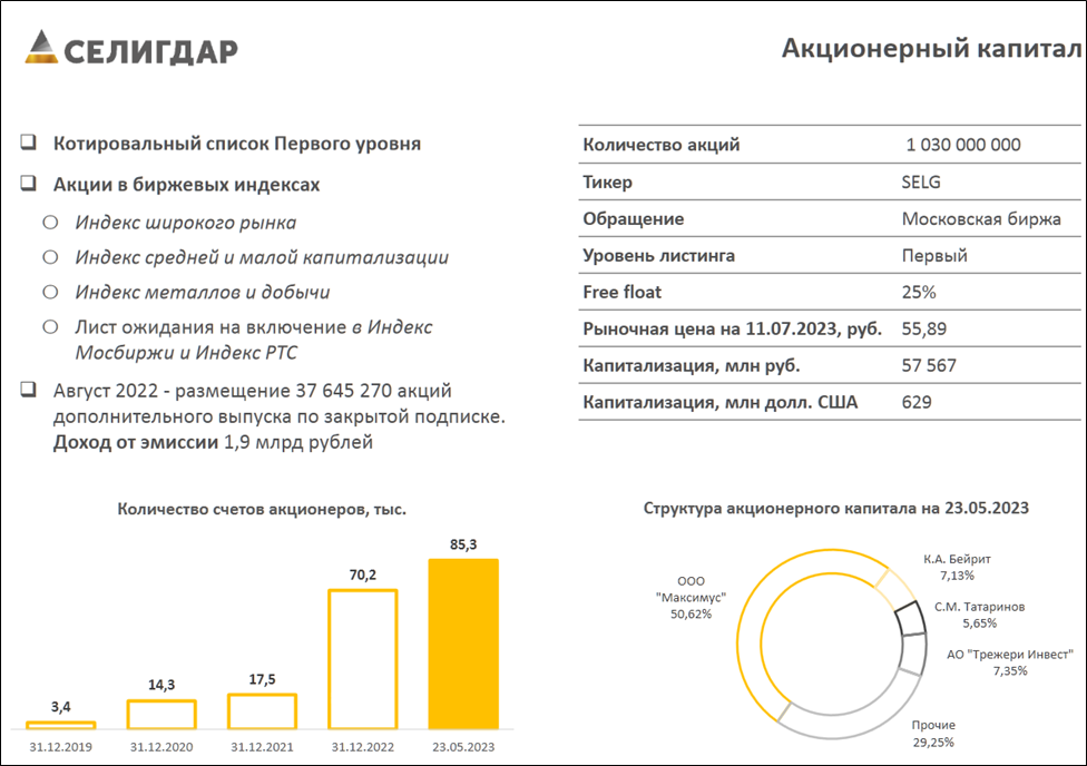 Чуть более 50% акций принадлежит ООО «Максимус». В свободном обращении 25%. Акции Селигдара входят в котировальный список первого уровня на Мосбирже и в несколько индексов. А с 22.09.2023 они были включены в индекс Мосбиржи и РТС.