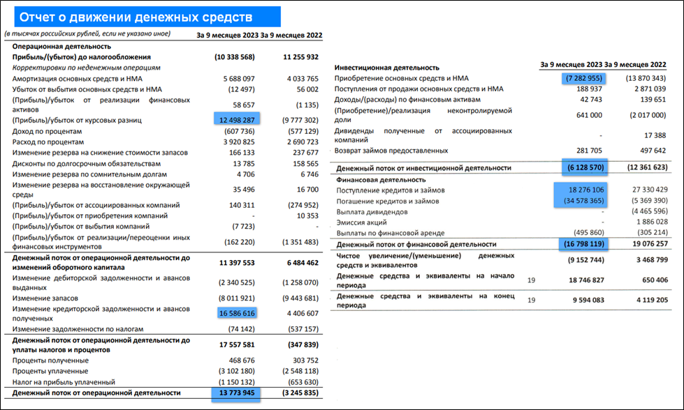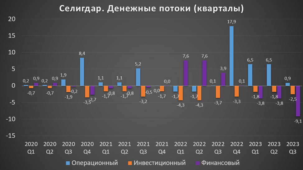 Операционный поток за 3Q 23 значительно слабее, чем в среднем за первые два квартала, но всё же лучше год к году. А кап затраты, наоборот, подросли относительно начала года.
