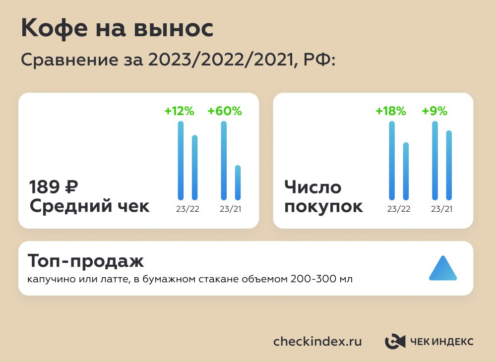 ▪️ Кофе на вынос – средний чек покупки 189 руб., на 12% выше, чем в 2022 году, на 60% выше, чем в 2021 году. Число покупок - выросло на 18% по сравнению с 2022 годом, на 9% по сравнению с 2021 годом.