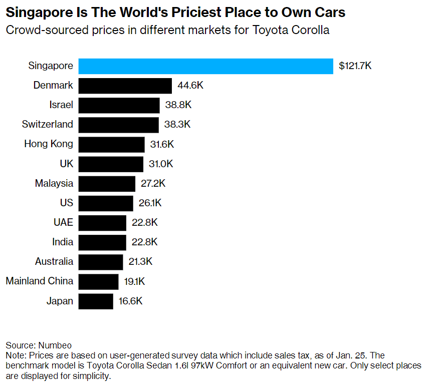 Сингапур, мечта релоканта. Тойота Королла, 1,6л оценивается в 121 700$. В США - 26 100$. Но это ладно. Оказывается, что нельзя купить машину без покупки свидетельства на право владения (Certificate of Entitlement - COE) - разрешения, дающего право владеть и пользоваться автомобилем в Сингапуре в течении 10 лет.