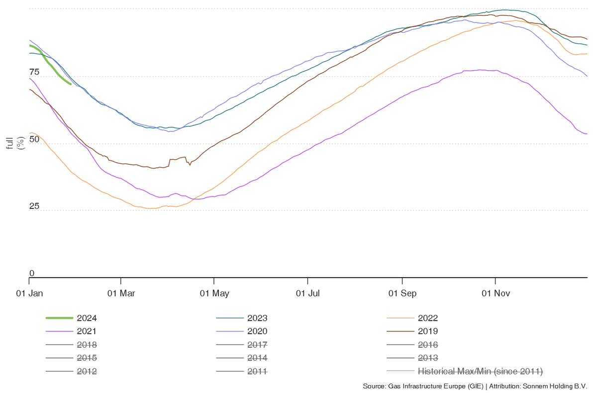Уровни заполненности газовых хранилищ Европы на 27 января 2023.