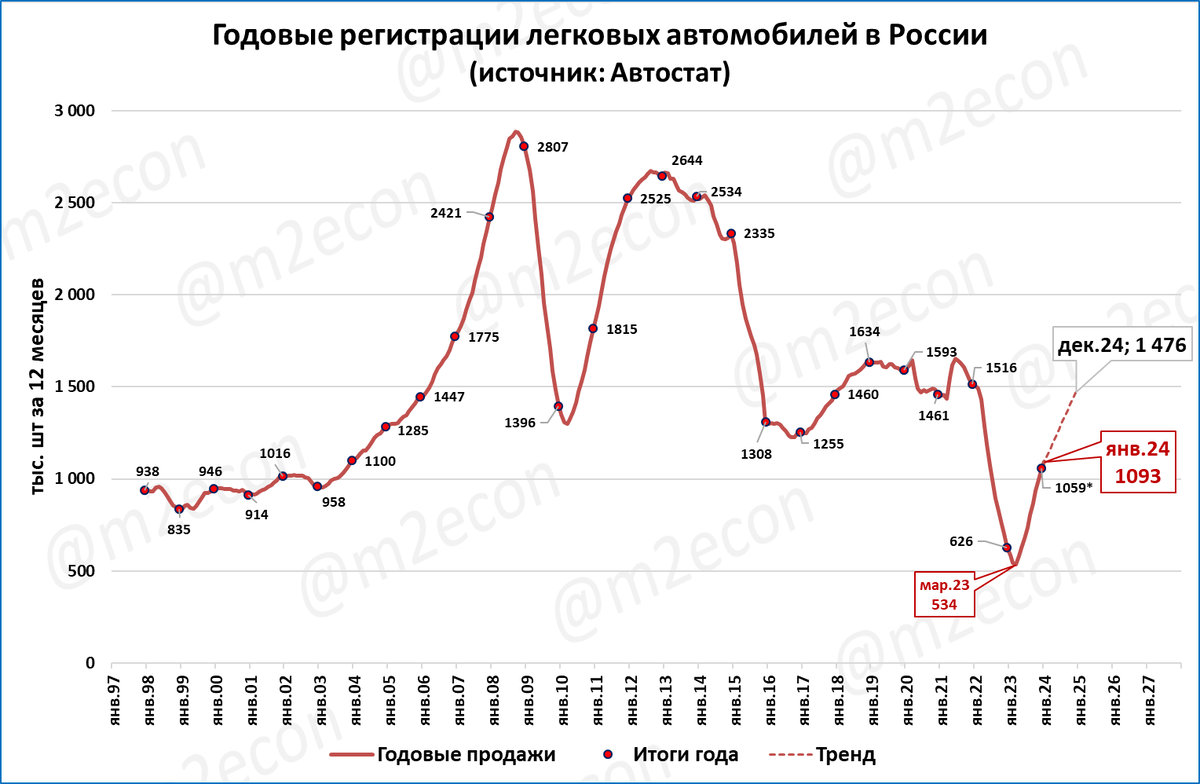 За последние 12 месяцев (скользящий год) регистрации составили 1,09 млн.
