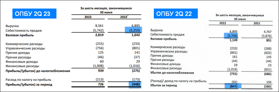 Из-за этого уменьшилась себестоимость, и соответственно выросла прибыль. На рисунке видно, как скорректированные в отчете 2023 года данные за 6М 22 уменьшили чистый убыток в 2 раза.