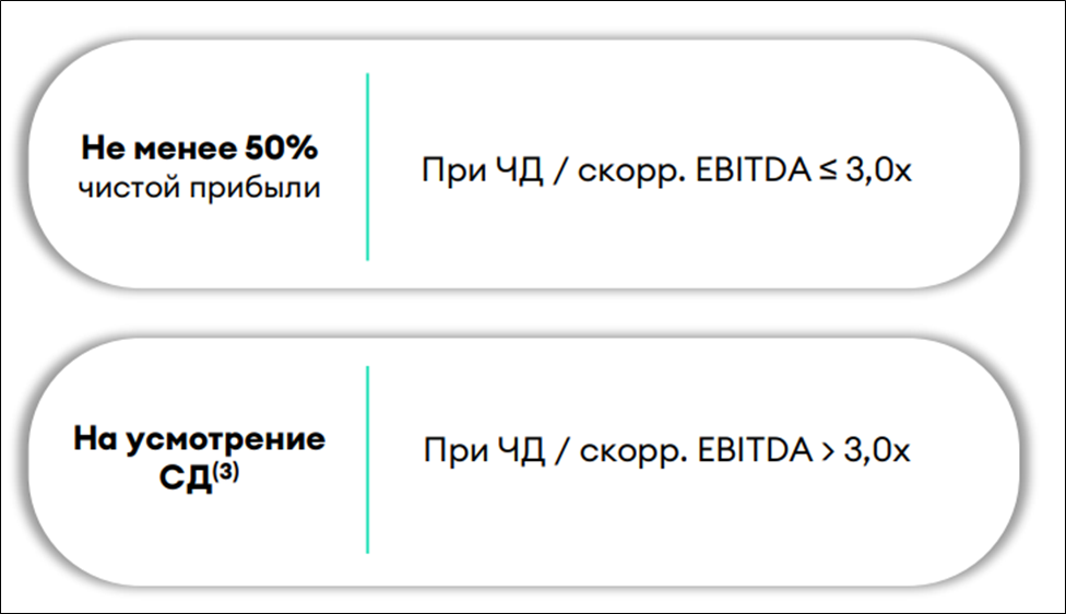 Согласно дивидендной политике, компания выплачивает не менее 50% от ЧП, если ND/EBITDA < 3. В остальных случаях - на усмотрении Совета Директоров.
