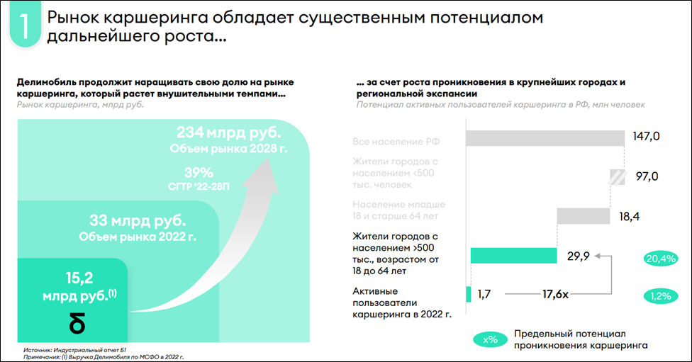 Делимобиль, ссылаясь на индустриальный отчет компании «Б1» (бывшее российское подразделение «Ernst & Young»), заявляет о существенном потенциале рынка каршеринга в РФ. Возможен рост рынка по 39% в год до 2028 года.