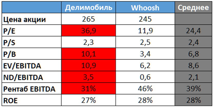Так как Делимобиль – это классическая компания роста, поэтому текущие мультипликаторы высокие. При этом, они заметно выше, чем у ближайшего аналога по бизнесу компании Woosh. Правда, нужно помнить, что у бизнеса Whoosh есть выраженная сезонностью, плюс повышенные регуляторные риски.