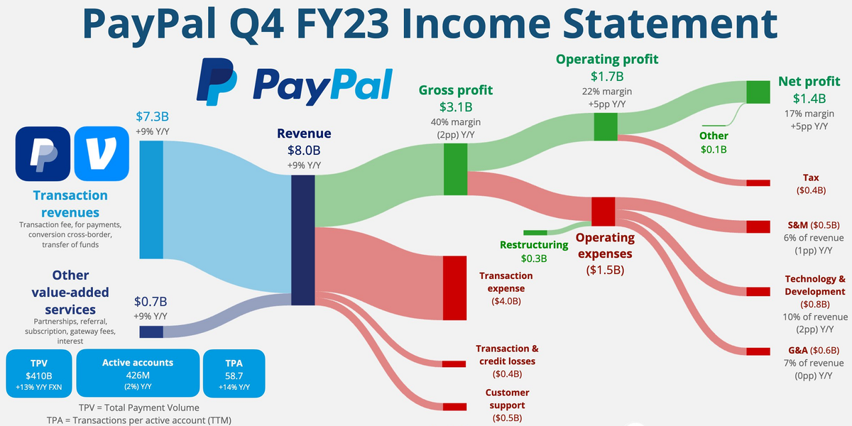 А зарабатывает он на транзакциях. Точнее на комиссионных с транзакций, платежей, трансграничных конверсий. Всё это принесло компании 7,3 млрд $ за квартал. Что на 9% выше результатов аналогичного периода годичной давности. Ну и 700 млн.$ принесло всё остальное - партнёрочки, рефералочки и вот это всё.