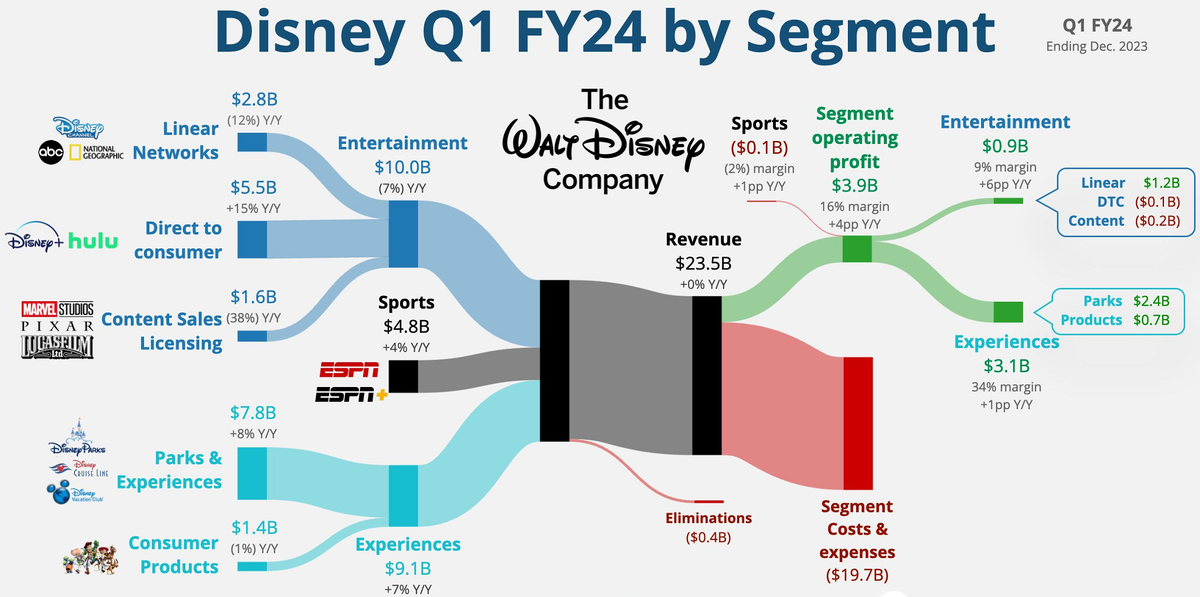 И вот, значит, больше всего денег заносят парки. 7,8 млрд $ за квартал. Вся индустрия ментальных развлечений принесла 10 млрд $. А ESPN всего 4,8 млрд.