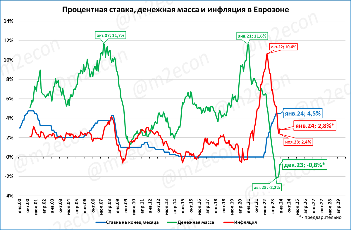 За 2023 год денежная масса в Еврозоне сократилась чисто символически, на 0,8%.