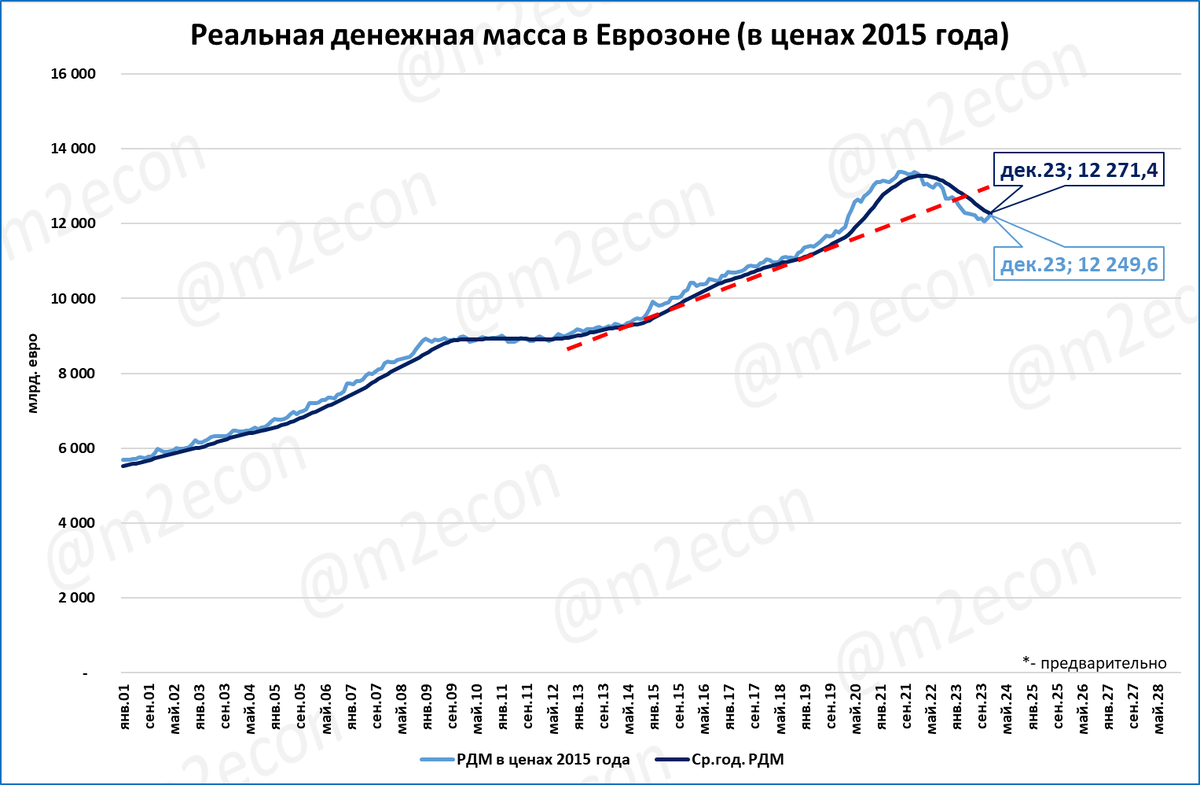 Реальная денежная масса (РДМ) в Еврозоне по итогам 2023 года уменьшилась на 3,6%.