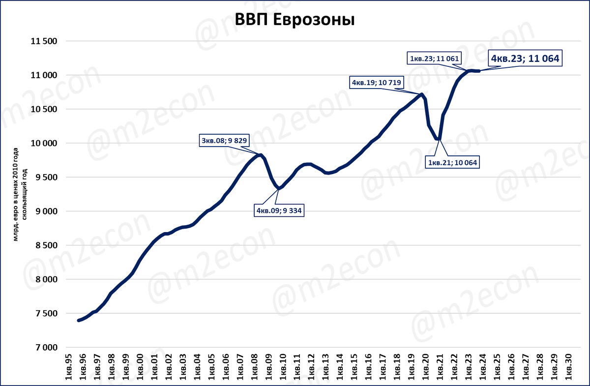 Поэтому неудивительно, что ВВП Еврозоны с 1 квартала 2023 года практически не растёт.