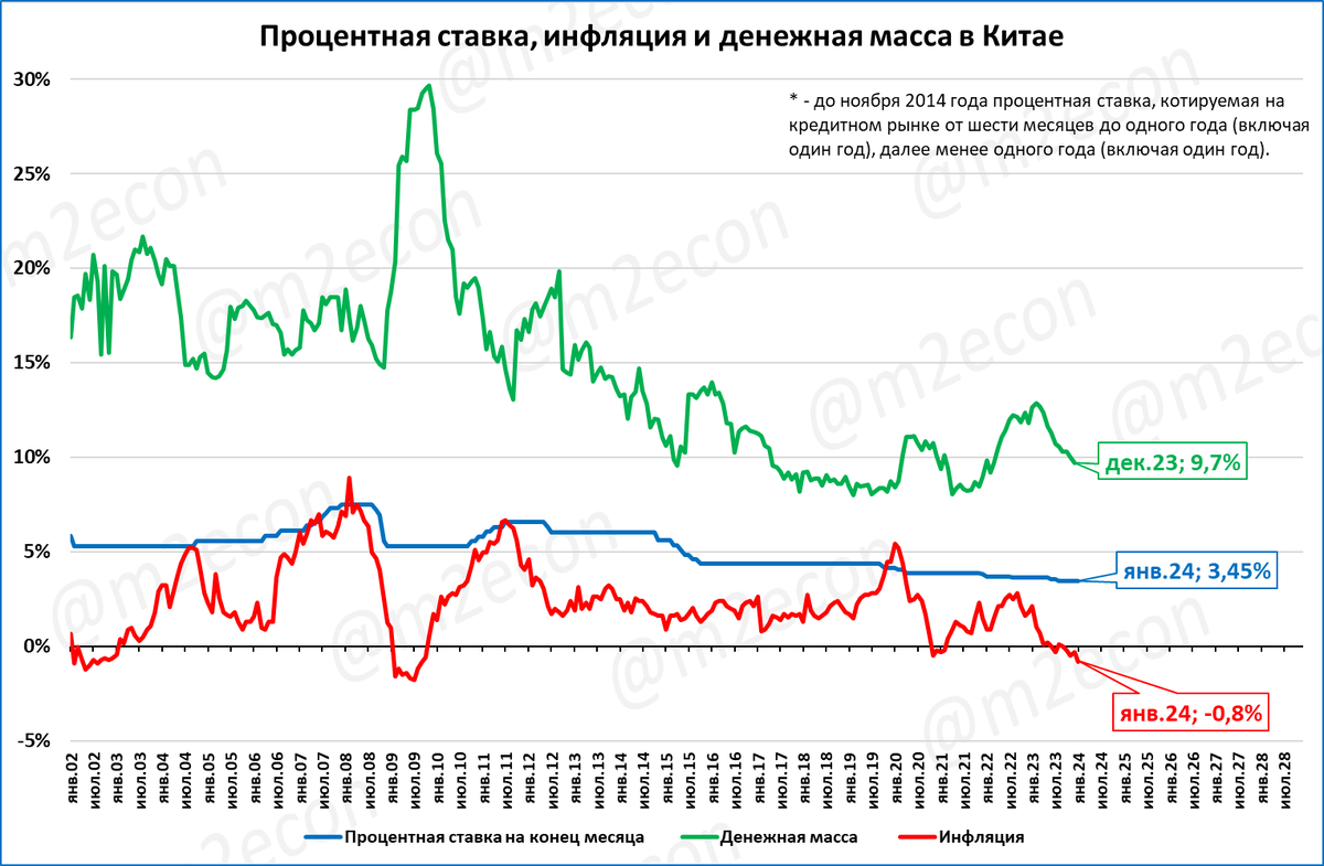 В Китае четвёртый месяц подряд цены показывают падение в годовом выражении. Так цены в январе 2024 на 0,8% ниже, чем в январе 2023 года, это четвёртый месяц дефляции подряд.