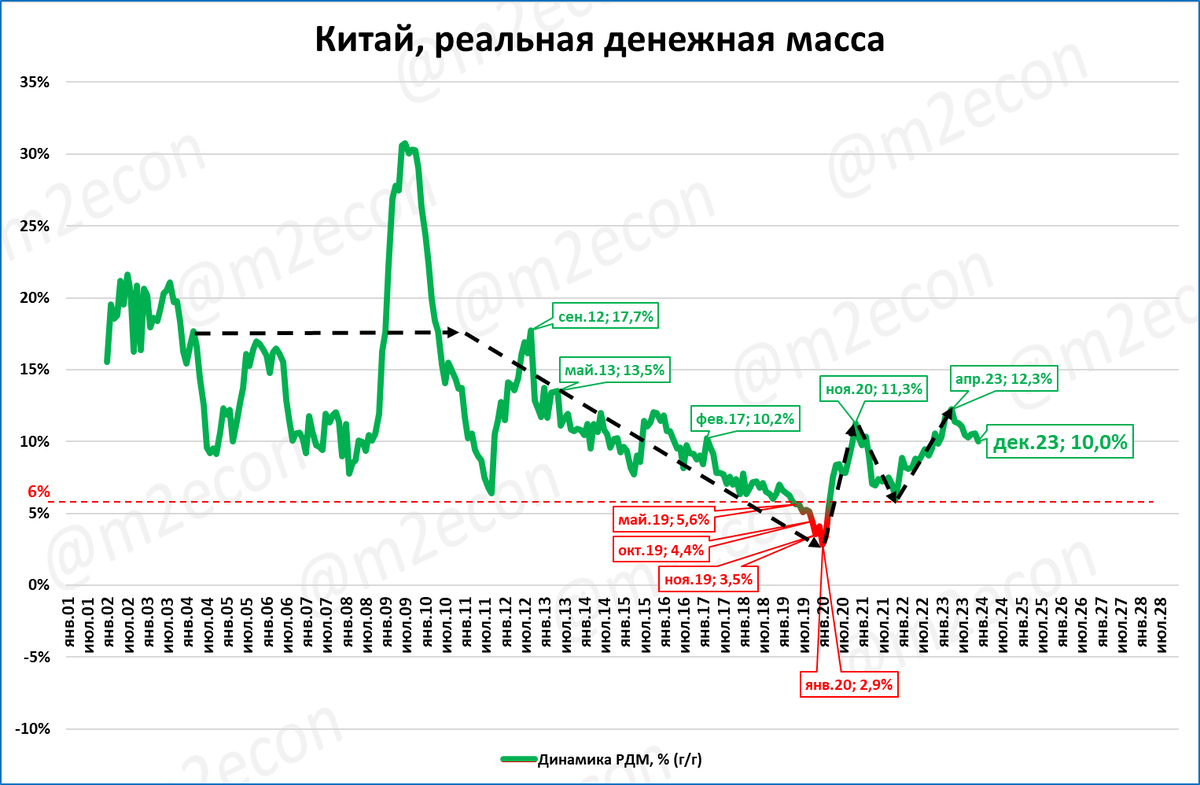 Он объясняет, почему индексы деловой активности в Китае и России сейчас выше, чем в США и Еврозоне. Потому что реальная денежная масса в России и Китае растёт, а в США и Еврозоне – падает.